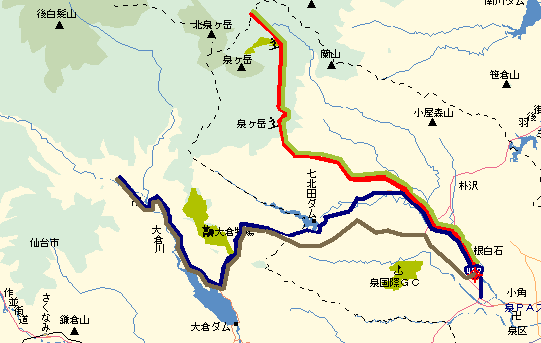 青:実沢のミニストップ→七北田ダム→定義如来→大倉川→定義山(頂上?)