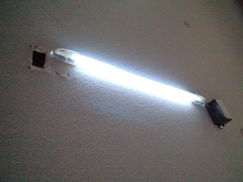 | 3列目のルームランプ取付 白のネオン管です。 本当は、ちゃんとしたものを使いたかったんですが お金が無いのでネオン管2本つけてましたが 1本は割れて現在1本で何とかやってます |